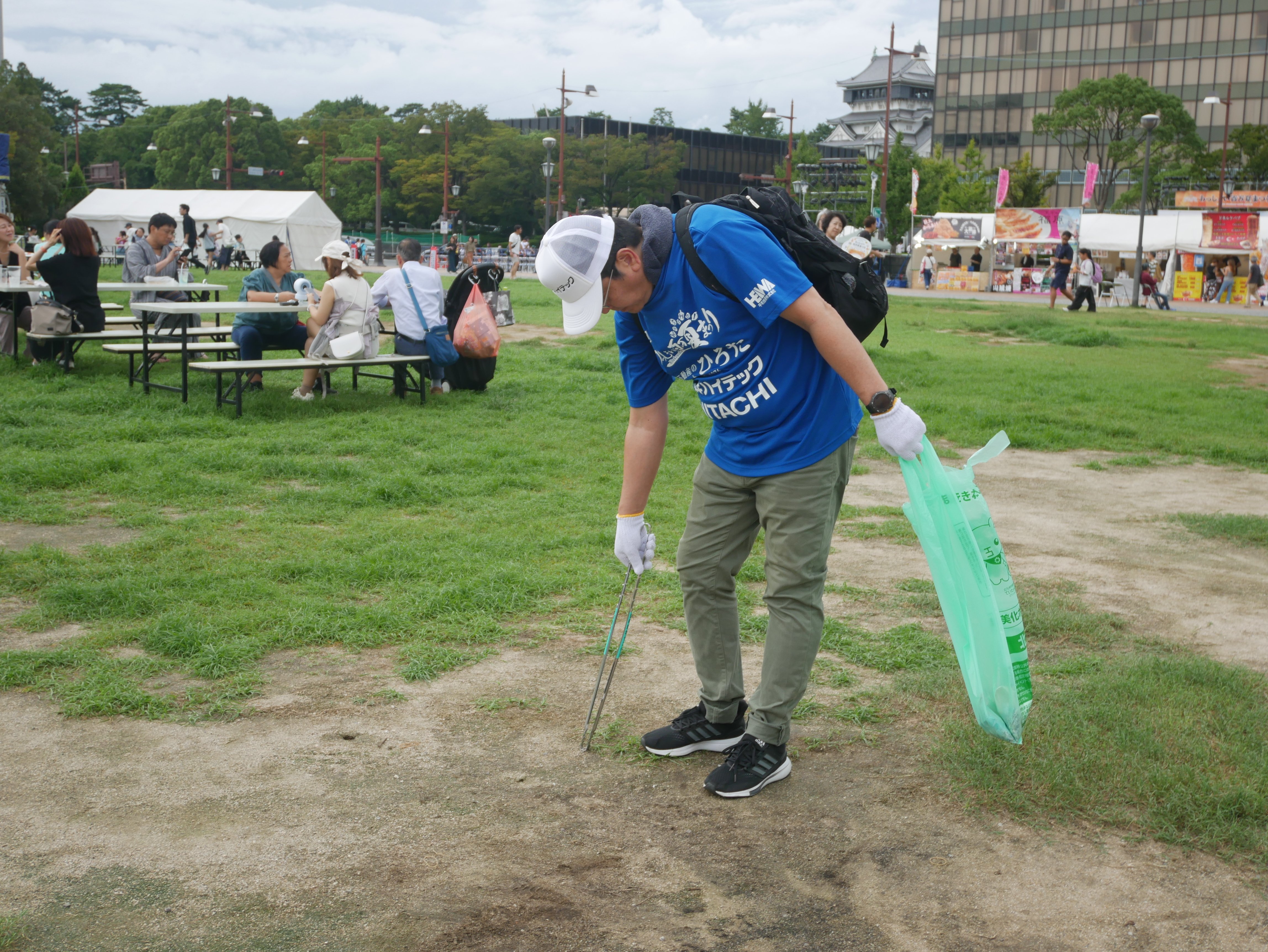 今回ボランティアには、28名の方に参加いただき、当日は会場周辺のごみ拾いを行いました。暑い中での活動となり、熱中症対策および安全面に配慮するため、グループに分かれての活動とし、定期的に休憩を取りながら元気に活動することができました。
